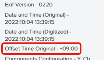 自分が過去にアップロードした写真をさかのぼって調べてみると、先代メインスマホ(Android 9→10)で撮ったのにはなくて、今のメインスマホ(Android 11→12)とサブスマホ(Android 11)のにはこの"Offset Time Original"の項目があります。