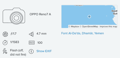 どこで撮った写真も、アップロード先では撮影場所が”Font Al-Da’da, Dhamār, Yemen”になってしまうんです。小さい地図上の指す位置は緯度0°・経度0°あたり。そこイエメンじゃないし、イエメンの近くですらないです。