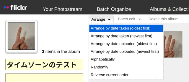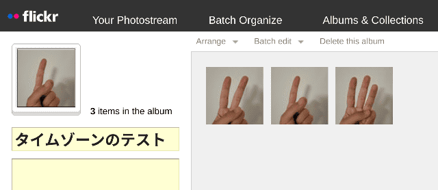flickrにテスト用のアルバムを作って、この3枚の写真を格納します。