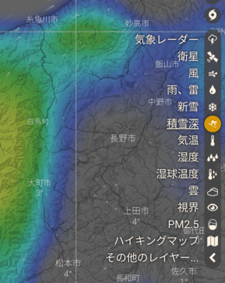 Windy情報だと、明日到着予定の大町市は完全に積雪エリアに入ってるけどほんまかなあ・・・?