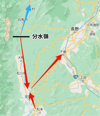 じゃあどうなってるの?というと、松本からの水も青木湖からの水もいったん安曇野あたりに集まって、長野市の方に抜けているということのようです。そして最後は信濃川に合流して日本海へ。
