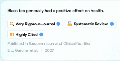 上の例だと、「紅茶が体にいい」という論文は、システマティックレビューだというだけでなく、めっちゃ審査の厳しい学術誌(Very Rigorous Journal)に載ってて、ほかの論文からいっぱい引用されてる(Highly Cited)ということもわかります。