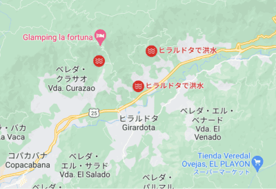 Googleマップで見てみると、町の北の方で洪水が発生しているとの情報も出ていました。こんな機能あったんや・・・