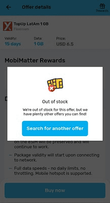 Out of stockって!?eSIMって売り切れるもんなん?ラテンアメリカシリーズでいろいろプランを変えてみても同じ。前のeSIMがインストールされてるからあかんのかもと思って、端末から削除しても変わらず。