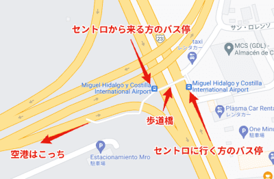 空港からだと、さっきの図の歩道橋を渡って「セントロに行く方のバス停」で待つわけですが、ここにはセントロに行くバスと行かないバスの両方が通りがかります。