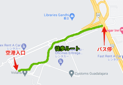 バス停と空港の間にはずっと歩道がついているんですが、Googleマップでは歩ける道だという認識がされていないようで、交通機関での経路検索をするとこの間を無理やり配車サービスで移動しようとして不自然なルートが出ます。