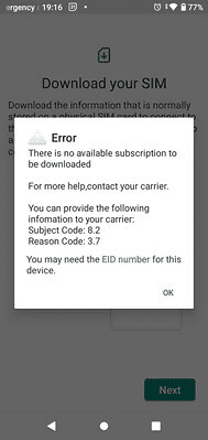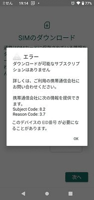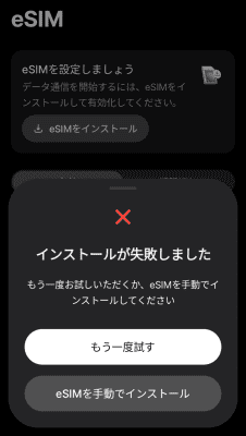 どちらのエラーになるかは、eSIMのインストールを何度か繰り返すと変わったりします。