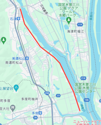 木曽川と長良川にはさまれた中洲のようなエリアのうち、JR関西本線より南の沿岸。折り返しで18kmぐらい。