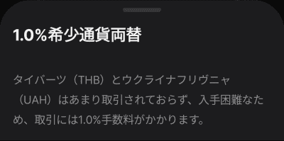 タイバーツ(THB)とウクライナフリヴニャ(UAH)はあまり取引されておらず、入手困難なため、取引には1.0%手数料がかかります。