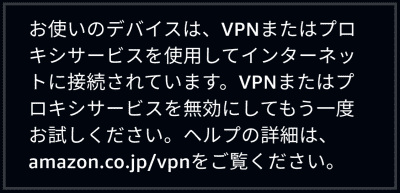 有料VPNを使っても、経由サーバをいくつか切り替えないと再生できなかったみたいな話を見かけるけれど、それはVPNサーバのIPアドレスがAmazon側のブラックリストに載ってしまって、いたちごっこをしているからだと思います。