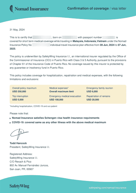 保険のカバー国を証書の文中に好きなように含めることができます。保険の値段の変わるアメリカとか、SafetyWingの補償対象外のキューバとかを入れようとするとエラーが出るけれど、それ以外は自由に。