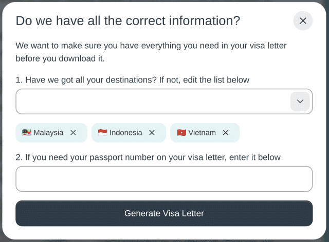 どこかの国での入国に必要になるかもしれない保険の証書は、ダッシュボードでGenerate visa letterボタンを押すと生成できます。