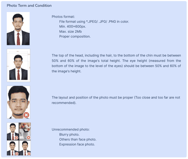 Proper composition.The top of the head, including the hair, to the bottom of the chin must be between 50% and 60% of the image’s total height. The eye height (measured from the bottom of the image to the level of the eyes) should be between 50% and 60% of the image’s height.