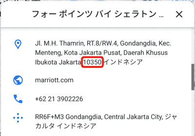 インドネシアでは、Googleマップで物件を見たときの赤囲いの位置の5桁の数字がPostal Codeになっているようです。なので、これをそのまま入れればOK。