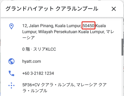 Googleマップで物件を見たときの赤囲いの位置の5桁の数字がPostcodeになっています。