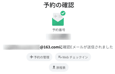 するとこんなふうに「○○@163.comに確認Eメールが送信されました」と表示されたんですが、“163.com"ドメインのアドレスなんて知らないです。たぶんTrip.comがこちらの代理でAir Asiaで予約を取ったときに内部的に使ったアドレスなんだと思うけれど。