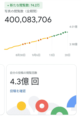 日々のこまめな活動が生きているのか、Googleマップへの投稿写真のアクセス数が今日あたりで4億を超えました。