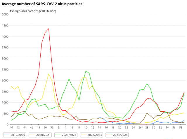 定点医療機関あたりの患者報告数と比べてみると、増減の連動はあるものの、ウイルス総量は増えても病院にかかる人の割合は減ってきているように読めます。
