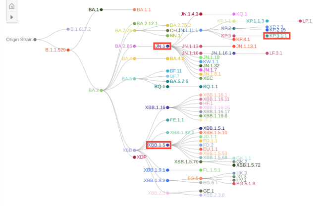 系統樹的にはこんな感じ。10月からワクチン接種が始まったJN.1は、KP.3系統の直系の先祖(?)になるので、去年打ったXBB.1.5のワクチンよりはだいぶ効きそう。