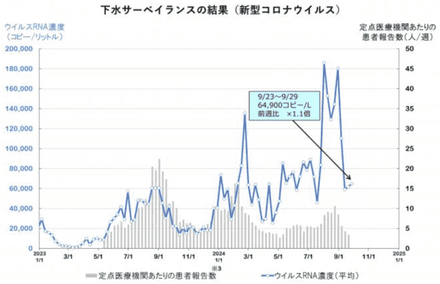 札幌の下水に含まれる新型コロナのRNA濃度は、この8〜9月に2022年以降最大のピークを迎えていて、今ようやく落ち着いてきている様子。夏にピークがあって秋に急に落ちるのはこの3年共通しています。