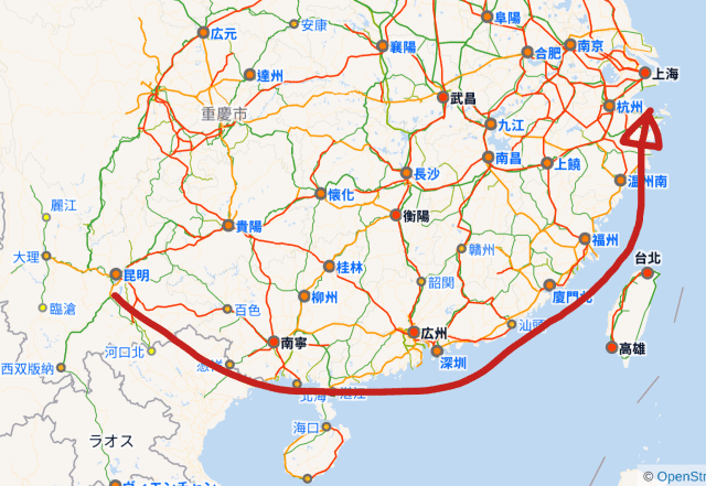 こんな感じで昆明スタート上海ゴールにしようかな?