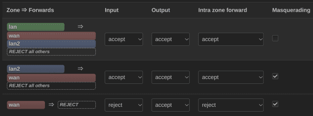 ファイアウォール設定を厳格化するため、lan2の行のInputはrejectにして、