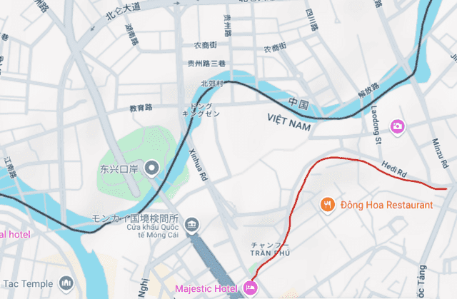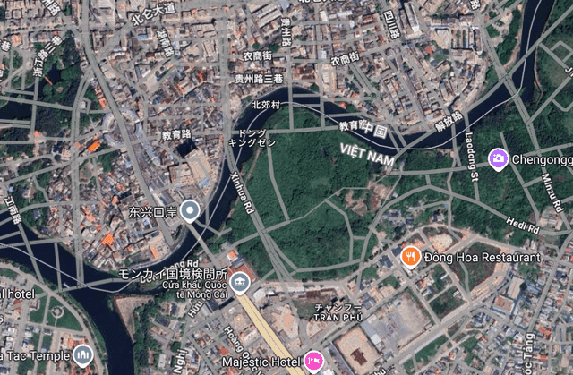 これ、ぱっと見だとよくわからないけど、川の南のベトナム側の道は正しく描かれていて、川の北の中国側の道は南東に500mほどずれてベトナム側にはみ出しています。つまり、川の南では両方の国の道がダブって描かれています。
