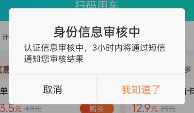 そして緑(滴滴)はパスポートを撮影して情報を登録すると「3時間以内に結果を通知します」といいつつ、1日たっても何の音沙汰もなくずっと「実名認証ができ次第使えます」と出るのみ。