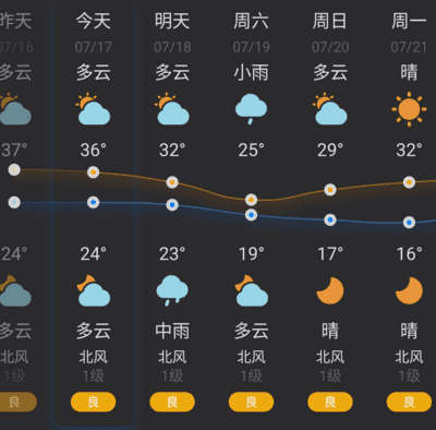ちなみに昨日(7/17)の朝時点での墨迹天气の予報はこんな感じ。前から見えていた7/19の気温低下が不気味やけど、とりあえず7/17を乗り切ったので、あとはまともに出かけられる気温に落ち着きそうかな。