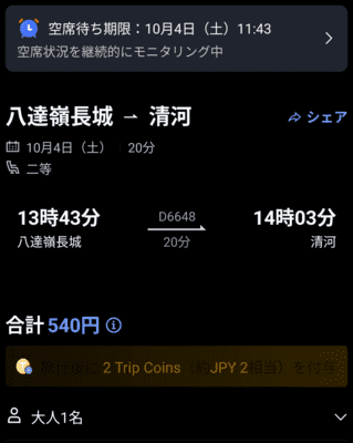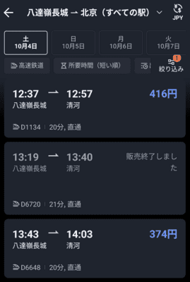 帰りの高鉄をTrip.comアプリで検索してみると、「販売を終了しました」じゃない便があるのでこれ乗れる?バスで2時間近くかかるところが数百円で20分で帰れるならそっちがいいわー。