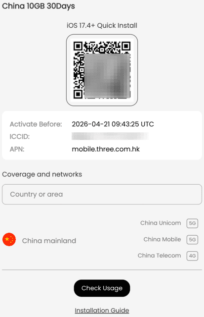 それでeSIMダウンロード用QRコードと利用量確認のURLを開いてみると、Pingweのとそっくり。URLのドメインがqrsim.netなのも、APNがmobile.three.com.hkなのもいっしょ。キャリアも
