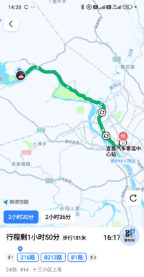 宿のある宜昌东站周辺まで経路検索をすると、帰りは最初に十三小区のバス停から216番のバスに乗って、途中2回乗り換えをするような経路が出ます。