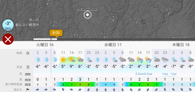 墨迹天气の最低気温は、ここ数日丽江との900mの標高差の逓減率と合わない10℃差ぐらいを指しているので、Windyの方が実態に近そうな気はするけど、どっちにしてもこの寒さはこわいです。そして明日天気いまいちそう(>_<)
