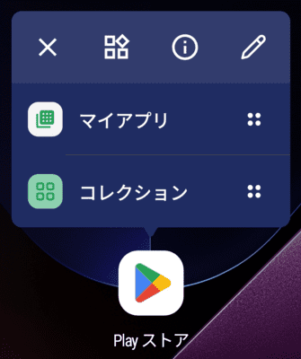 ふつうに起動してからその画面まで行こうとすると、直感的には見つけづらい3タップ分の画面遷移が必要なんですが、長押しメニューからだと「マイアプリ」を選ぶだけでいけます。さらに長押しメニューの個別のアイコンをデスクトップにドラッグアンドドロップで置けるので、そうすると長押しすら必要なくなります。
