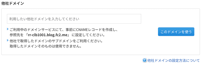 ・FC2ブログに設定するドメインとしては、他社で取得したドメインのサブドメインをご利用ください。取得したドメインそのものを設定した場合、ドメイン名の仕組み上トラブルの原因となる場合があります。