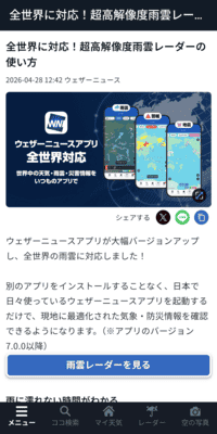昨日ウェザーニュースアプリを立ち上げると、全世界対応のお知らせが出てきました。