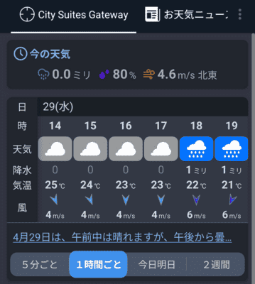 でも「今の天気」タブでは数時間後まで降らないことになっていました。うーん。