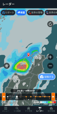 ちょうど昨日の午後に雨が降ってきたので雨雲レーダーを開いてみると、しっかり降水が見えていました。これいいかも!